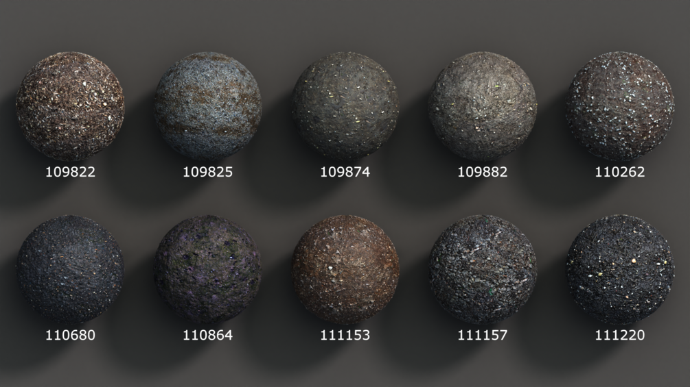 10 PBR tileable materials containing diffuse, normal, roughness, displacement, ambient occlusion textures, all in 4096x4096.